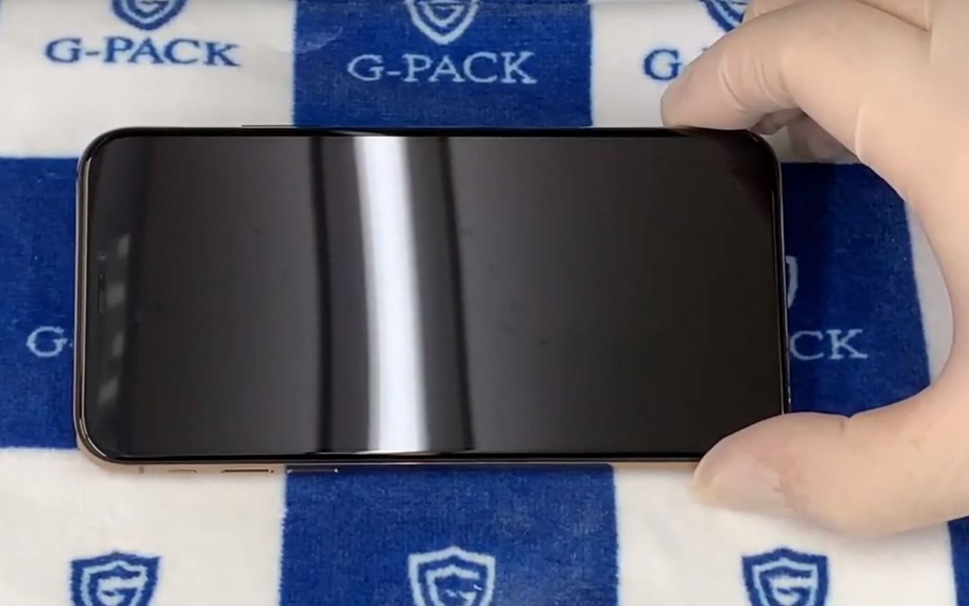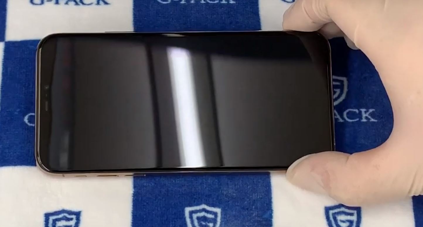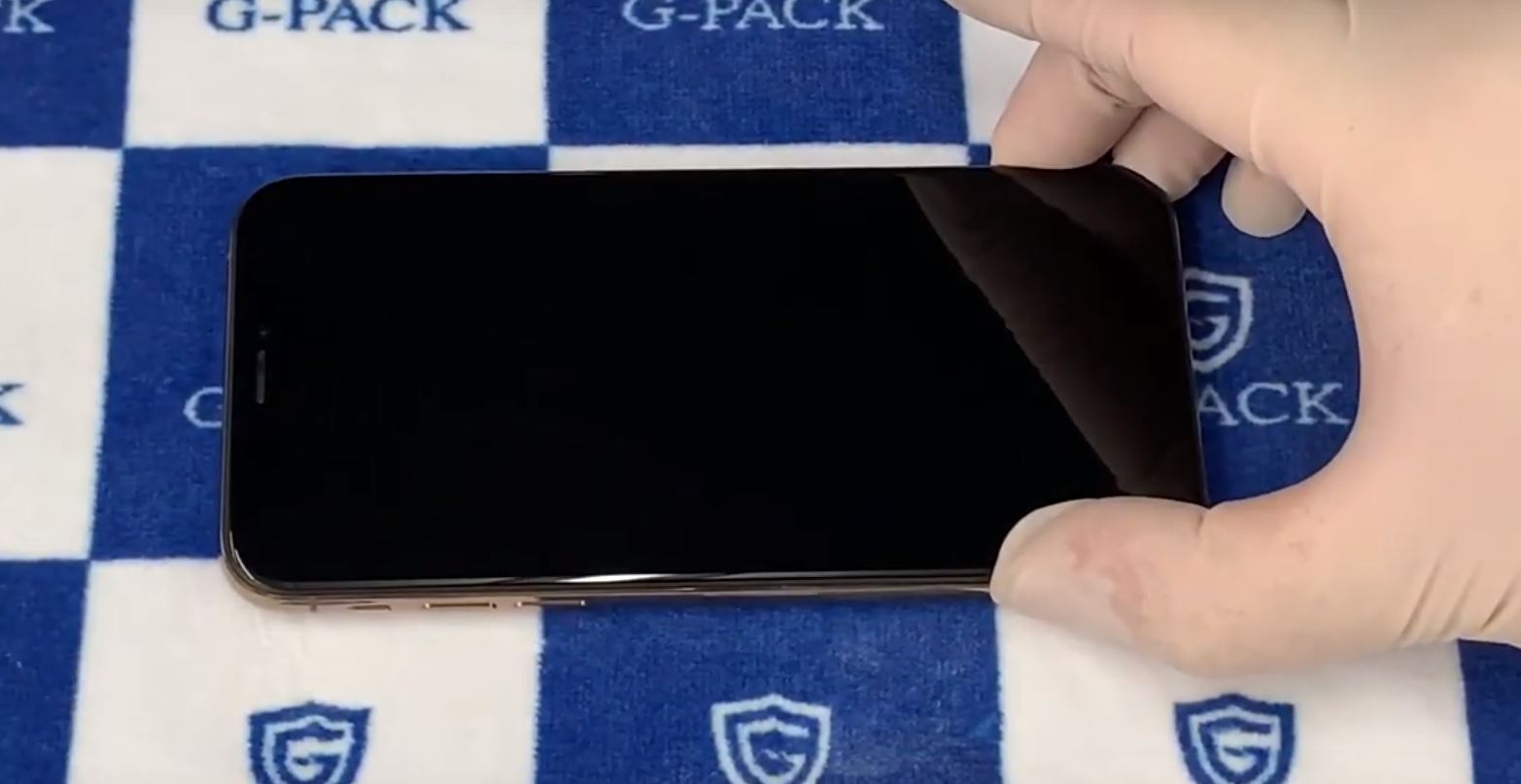 実際に動画内で使用しているスマートフォンはG-PACKを施工している状態になります。ハンマーで画面を叩く前は傷やヒビがないのを確認出来ます。